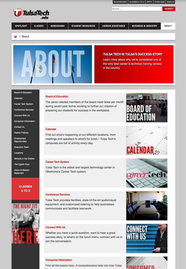 Tulsa Tech needed to move it’s current site from a Sharepoint platform to something that was more user-friendly for staff to maintain. They also needed the site to be accessible from mobile and tablet. They wanted to keep their current design, so our team built this site on WordPress utilizing their current look and feel. The site still dynamically populates class information from their SIS system, but now utilizes SOLR search in order to index the content from the various PDF files linked throughout the site.